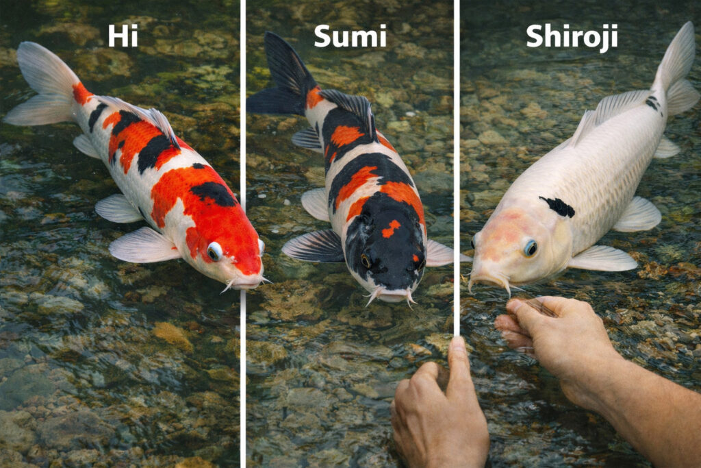 • Cá Koi: Tập trung vào phẩm chất màu sắc (Hi, Sumi, Shiroji), hình dáng cơ thể (body) và tính cách thân thiện với con người.