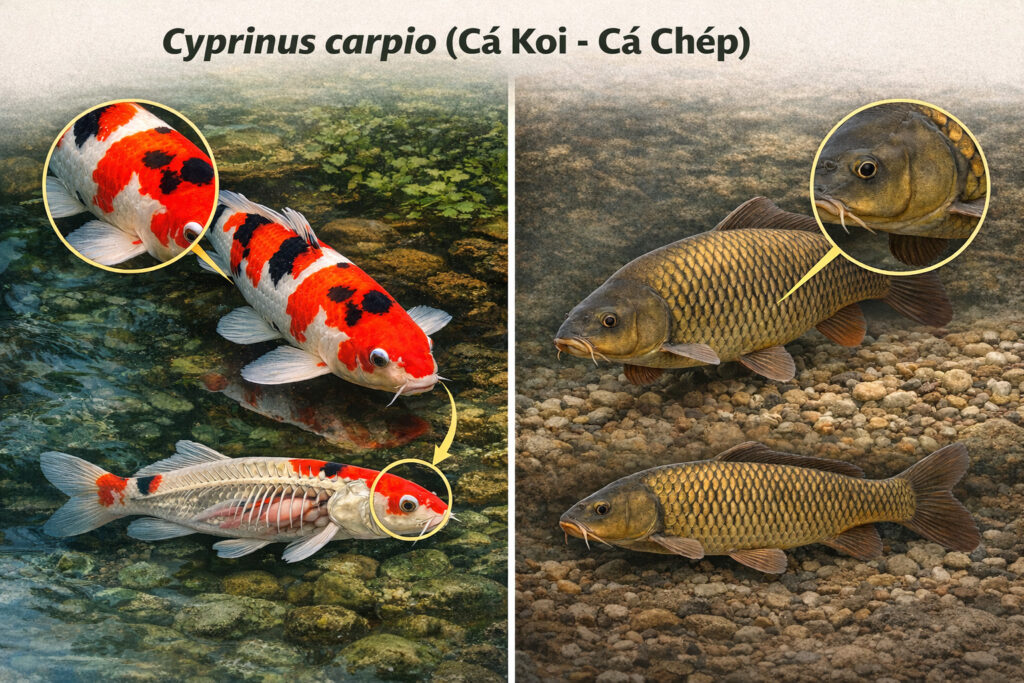 Tên khoa học của chúng là Cyprinus carpio. Về cơ bản, cá Koi là một biến thể được thuần hóa và lai tạo từ loài cá chép đen thông thường. Chúng có cùng cấu trúc xương, hệ thống cơ quan và đặc biệt là đôi râu đặc trưng ở khóe miệng – dấu hiệu nhận biết rõ nhất của dòng họ nhà chép.