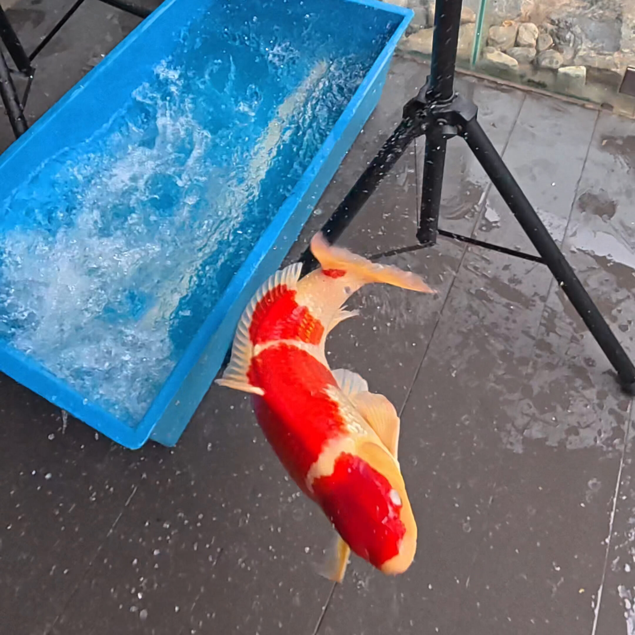 Nhiều người nghĩ chỉ cá nhỏ mới nhảy, nhưng thực tế cá Koi lớn cũng có thể bật rất mạnh. Đây là loài cá có sức rướn tốt, phản xạ nhanh, nhất là khi cảm thấy bị đe dọa. Vì vậy trong lúc đo, dù chỉ vài giây sơ suất, cá vẫn có thể nhảy khỏi tank.